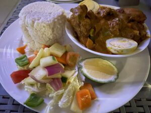 こちらの写真の左上の白い食べ物がウガリです。確かにそれ自体に味はありませんが、料理と一緒に食べると白いご飯のような感覚で食事ができて、おなかにもたまる、まさに主食です。レストランでは、お米のライスまたはウガリをチョイスできます。